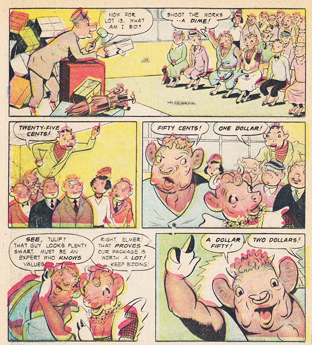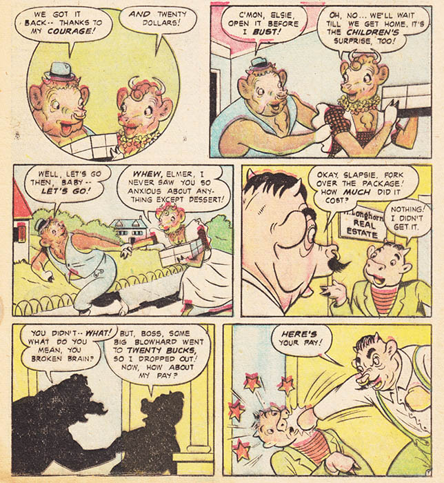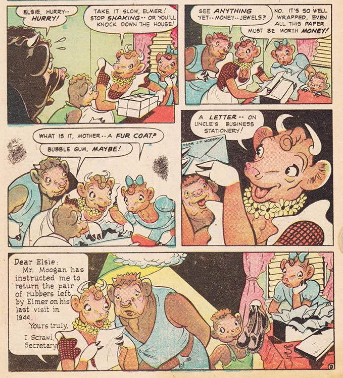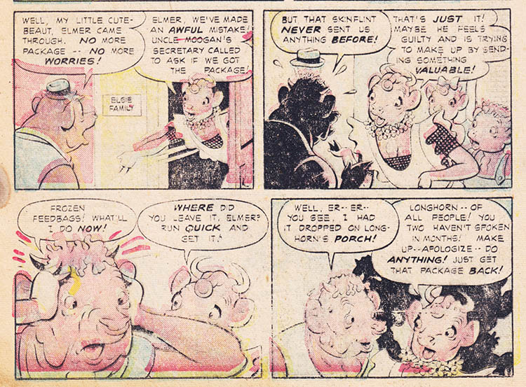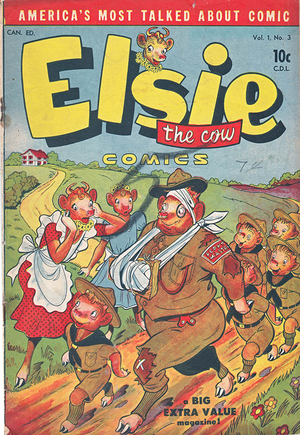 Yes! America's most talked about comic! Imagine the conversation! "Have you heard the news? There's a freakin' COMIC BOOK about ELSIE, that dress-wearing cow that sells Borden dairy products!" "DATELINE NEW YORK - Citizens stunned to learn of Elsie-themed comic book freely available on newsstands. Panic in the streets. National Guard called out. More to come." Elsie, her husband Elmer (of "Elmer's Glue" fame), their daughter Beulah, their son Beauregard, and twins Larabee and Lobelia have all made the jump from Borden promotions to adventures in whatever freakish hellworld spawned these bovine-human hybrids, and the Free World is all the more confused for it. Hey, relax, settle down, here, have a glass of milk.