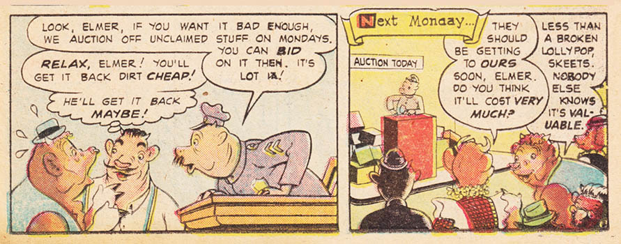 And now because Elmer's so dang clever they have to buy their own property back at the police auction. Way to go Elmer. Better smarten up there pal, that glue factory literally has your name on it.