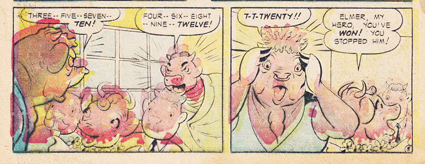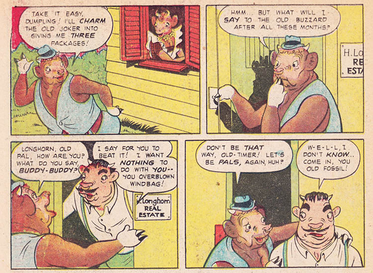 And we're back to a normal color space as Elmer attempts to sweet talk his way into rival Longhorn's horned heart. Will Longhorn be able to resist that snazzy hat as it highlights the "vest and bare chest" look? All signs point to PALS!