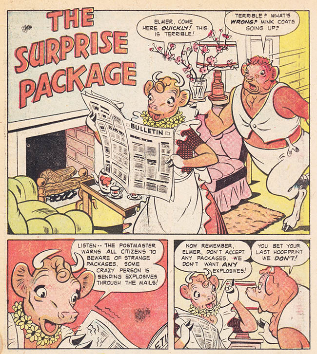 In today's thrilling dairy-mascot adventure, Elsie and Elmer must confront the reality of mail bomb terrorism head on, by not accepting any mail from anyone, any more, ever.