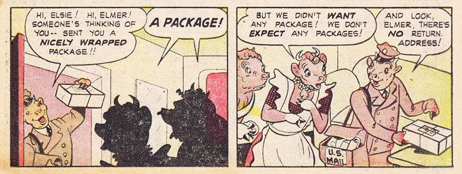 I wanna apologize for the terrible printing in this Canadian edition of Elsie. Sometimes one of the press guys comes in with a box of Timmies and before you know it, you've run out of two or three colors of ink. Bob didn't catch it because he was out having a smoke break, Dave left early for hockey practice, and Gord's cousin came in from Newfoundland with a trunkload of "screech" so he won't be any good for the rest of the shift. Anyway it turns out that the package WASN'T a bomb, it was from their rich Uncle Moogan! And now they gotta get that package back. Oh, Elmer.