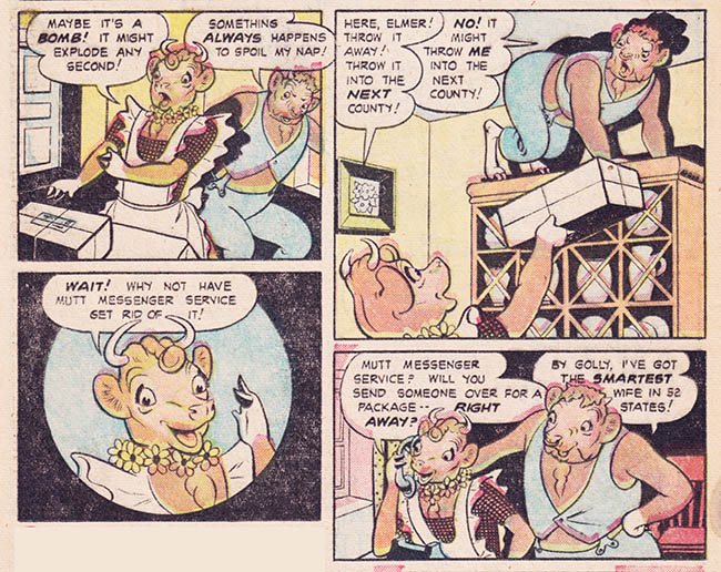 Elsie and Elmer come up with the correct solution to a possible terrorist mail bomb - call a messenger service and have it delivered to somebody else, and it becomes THEIR problem. Police would only complicate things. Also, Elmer forgot how many states there are. Or maybe Earth-Elsie went ahead and ratified that Puerto Rico and Guam statehood.
