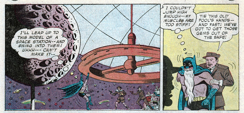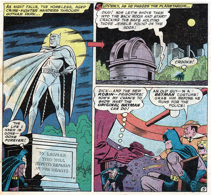 The life of a homeless drifter seems inevitable for our caped crusader until, as always happens in these comics, criminality appears in a highly unlikely form. I guess in the future nobody steals cars or robs banks, it's all moon-jewel heists.