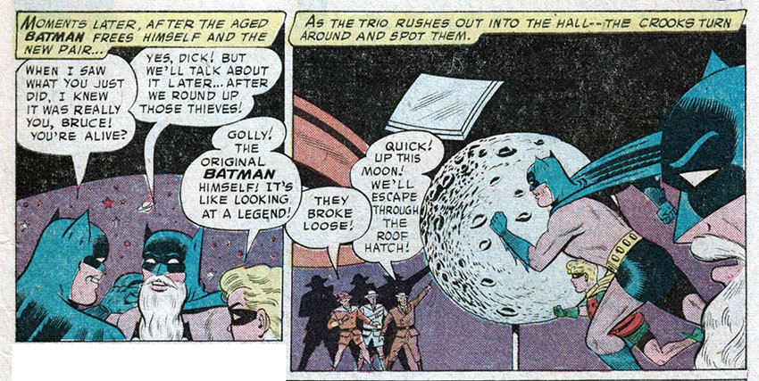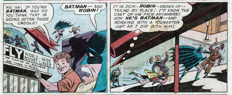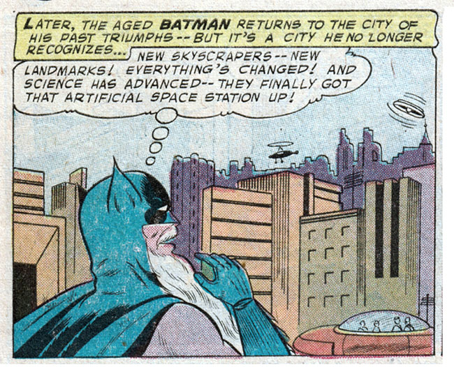 Sure, it's the future (see the rocket ship?), but crooks are still crooks and Batman is still Batman, still defeating crime with a left to the jaw, sending their funny future hats flying.
