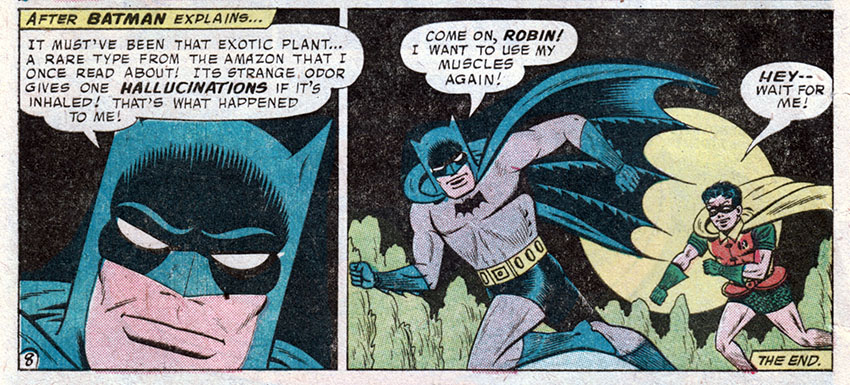 Why yes Robin, I must have been high as a kite. Now come on, I want to use my muscles. Maybe I'm still stoned out of my gourd? We'll find out! And that's the end of this Batman Day Observance Stupid Comic. But before we say good night, one more Public Service Announcement...