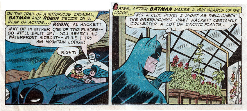 Notorious criminal Al Hackett has both waterfront AND mountain property? Notorious crime must be a moneymaker these days, thinks Batman as he indulges himself with a moment's relaxation among the blooms of Hackett's exotic plant greenhouse. Exotic plant greenhouses were all the rage amongst the notorious crime lord set that year.