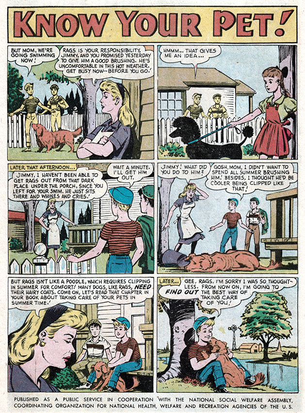 Hey kids, don't shave your dog! How stupid do you have to be to shave your dog, or to think that it's easier than just giving the pooch a brushing now and then? Just imagine the spanking Jimmy got in between Panels Five and Six down there, and you can see why Rags might want to give him some sympathy, instead of savagely mauling him.