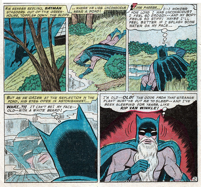 Trapped in a world he never made! It's Rip Van Batman, identical to Normal Batman, but for his long white beard and his stiffness. How did such a thing come to be?