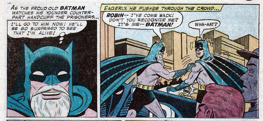 Sometimes we start to wonder exactly what Batman's detective skills are, if he's surprised a bunch of cops don't recognize a bearded old man in a Batman outfit as anybody but a bearded old man in a Batman outfit.
