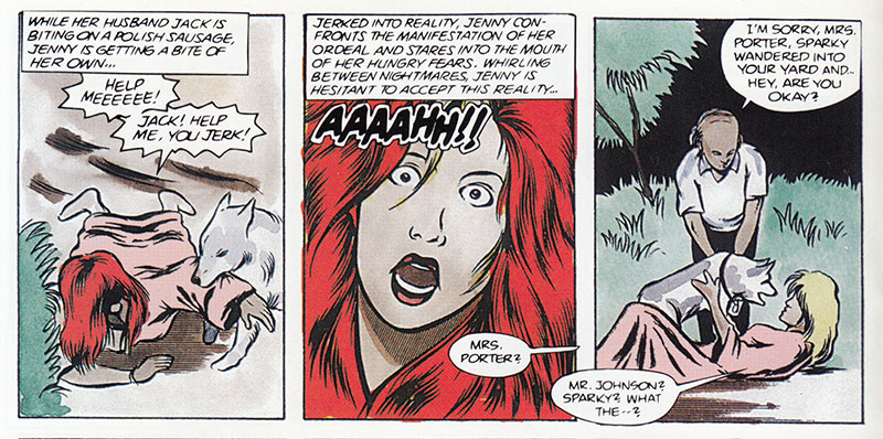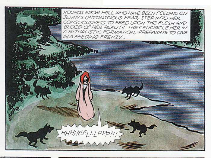 And in a ritualistic frenzy the fear-feeding hell-hounds switch gears to gnaw upon Jenny's actual flesh, as seen her by four easy to draw silhouettes. Look, we saw what happened when they tried to draw a cat, let's not push things.