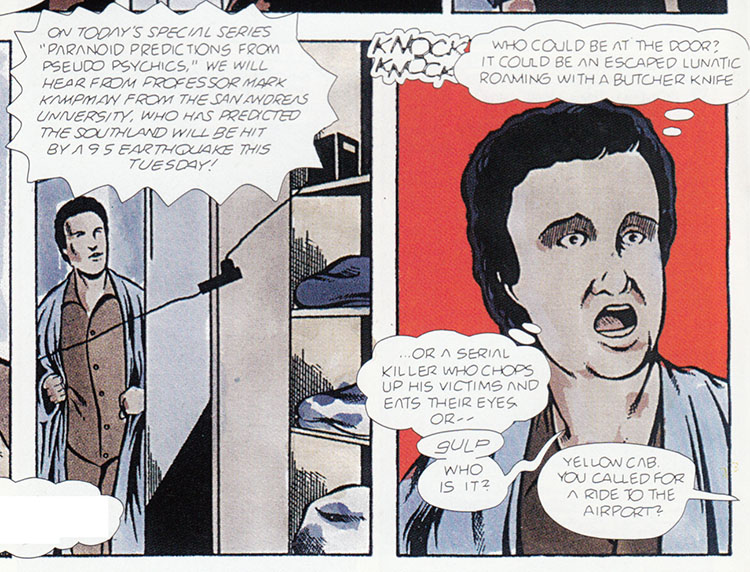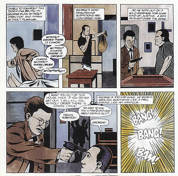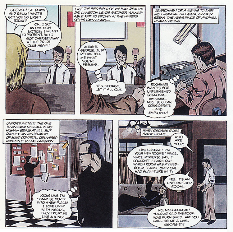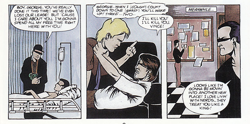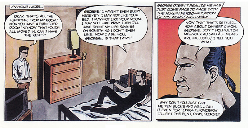 I'm kind of on Team Vince here; he may be a mooching creep but at least he didn't try to shoot his way out of his problems. Sadly, Vince was merely a manifestation of George's deep-rooted sense of helplessness. Except... here we see Vince getting another roommate, so I guess he was real after all? I am not so much Future Shocked as I am Future Confused.