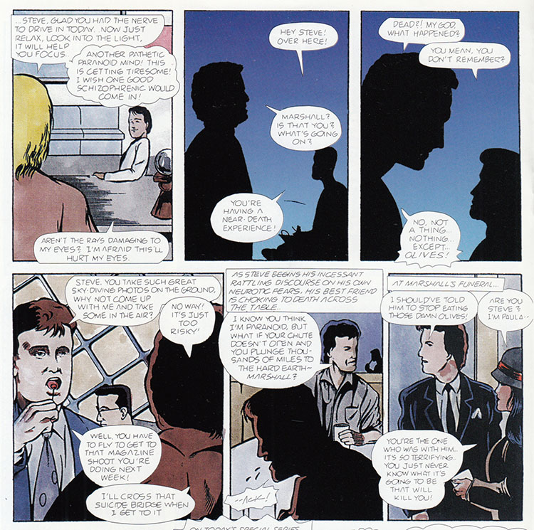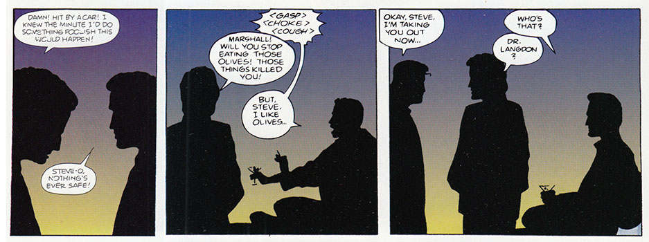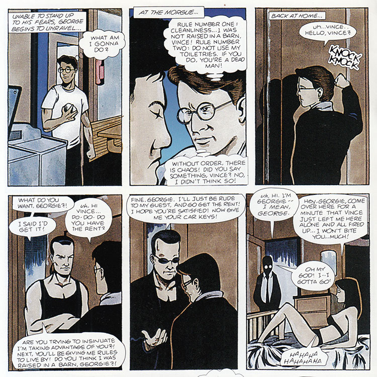 We learn a lot of things in this sequence of panels; Vince has a huge forehead which attracts women in their underwear, and that George works in a morgue. Did the comic mention that before? Nope. Just drop it in there in a caption and hope the reader catches it. Do you lazy readers want this comic to do all the work?