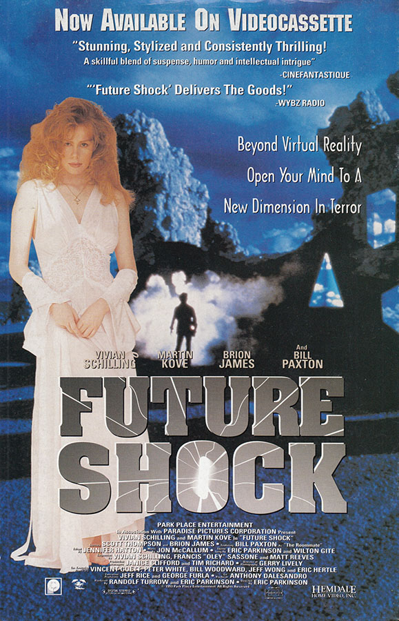 Before (or maybe after, there's no date) it was a comic book, Future Shock was a 1994 film that kinda came and went without making an impact, in spite of what Cinefantastique and WYBZ Radio would have us believe. But let's look a little closer at some of the names involved. Bill "Titanic" Paxton? Brion "Blade Runner" James? And Vivian "Soultaker" Schilling, right there on the poster, making us think we're watching Mystery Science Theater 3000 experiment #1001? Unlike "Soultaker", Schilling only wrote a third of this movie, so it isn't quite the self-insert fan fiction it could have been. But who's that with a segment direction credit? Matt Reeves, the guy with a Batman movie coming out next year, that's who. I guess everybody's got to start somewhere.