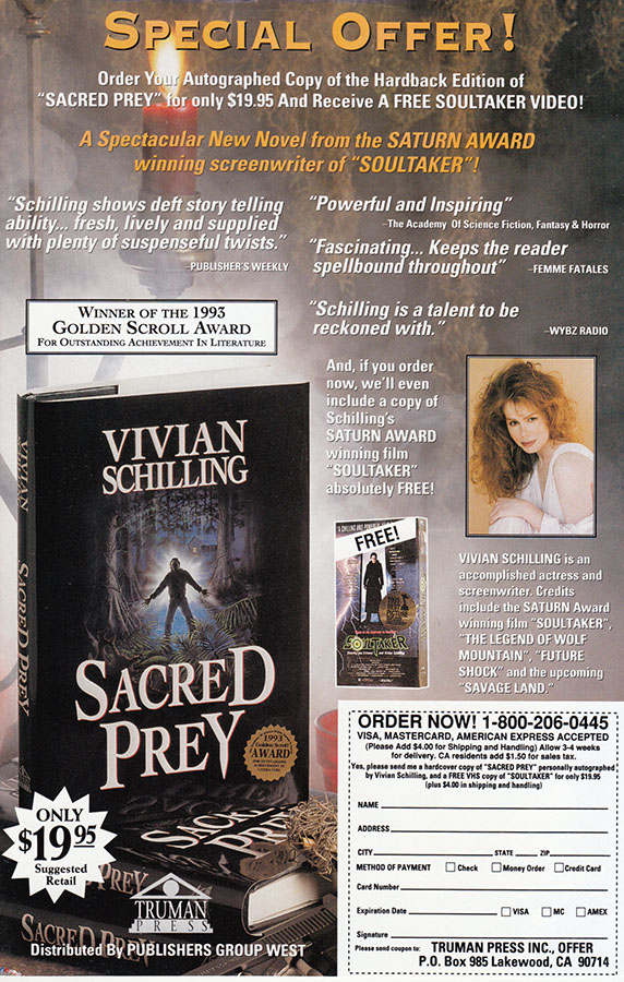 Just call this toll free number and get your very own copy of "Sacred Prey" which, sadly, is not about hell-hounds working themselves up into a ritualistic feeding frenzy. It comes with a complimentary videocassette of "Soultaker", though. Order now, they only have two or three thousand of those left!