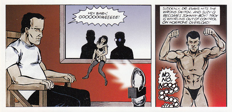 Gym locker rooms across the nation are filled with exploded heads. Men simply cannot stand to see other men without shirts on, especially if they're buff! Now send that lamp to Dr. Langdon and let's get this future shock on the road.