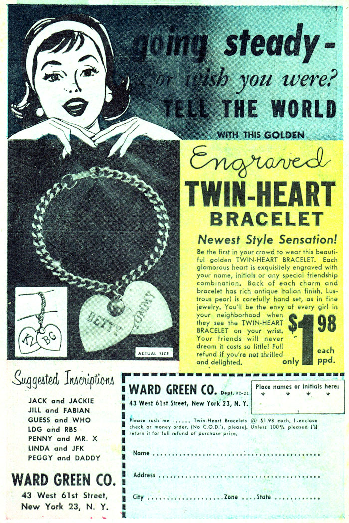 BONUS: Going steady... or wish you were? Then put the name of your steady or limerent object alongside yours on one of these gold-coloured-but-definitely-not-actual-gold charm bracelets! For only $1.98 you can support the marriage of President Jack Kennedy and his wife Jackie, or possibly his relationship with someone named "Linda", depending on your political leanings and affiliations. Or, you can frighten your parents by alluding to a relationship with "Mr. X", or frighten your teachers and other mandated reporters by showing your love for "Daddy"! No CODs, please!