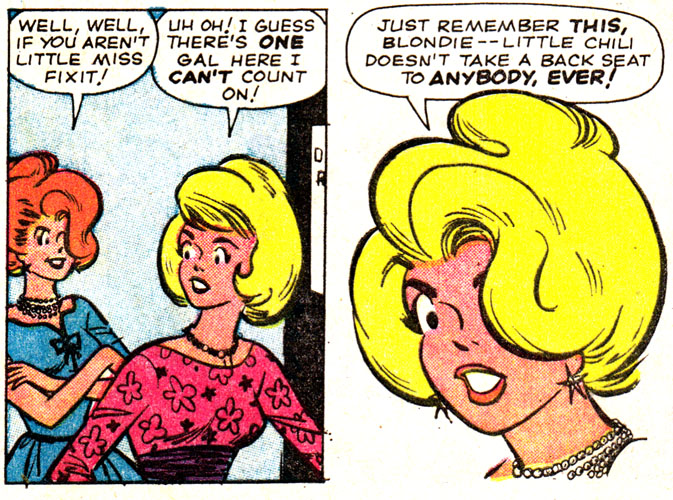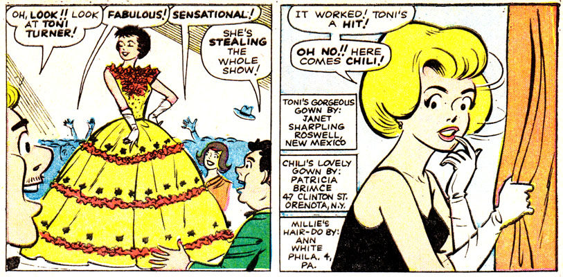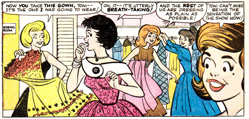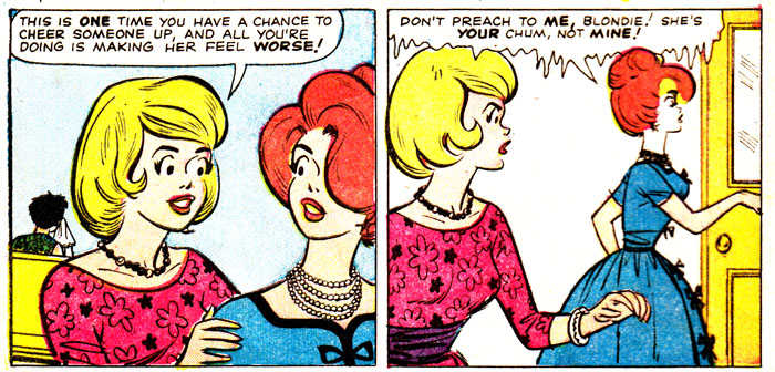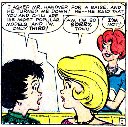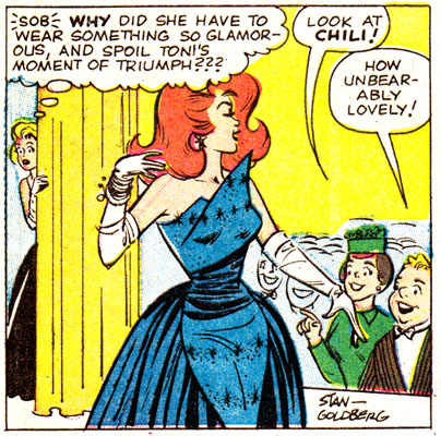 Let us now take a trip down Memory Lane... or possibly Mammary Lane, judging by this artwork... to the whimsical 1960s, when Marvel refashioned their fashionable fashion model soap opera Millie the Model into an Archie-esque humour comic drawn by Archie-esque Archie artist Stan G. A time when beautiful women's swan-like necks are matched by their Chinese Goose-like foreheads. A time in which even the most beautiful girls can sometimes feel sad!