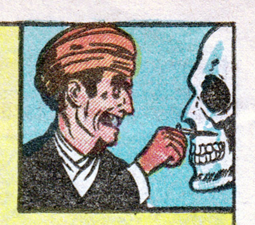 Consumed with mystical powers from beyond the grave, our voodoo swami threatens Tom with all the awesome witchcraft of... a small-caliber automatic.