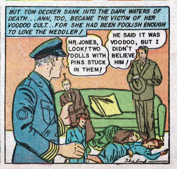 But Tom died, and then Ann somehow died too though we won't go into how that happened. And then the police showed up and they held up the voodoo dolls in such a way that the voodoo dolls and the actual corpses looked identical, which adds just that extra chef's kiss of confusion to this already confusing tale of Persia and voodoo and oil-prospecting Army grave robbers, decorated with randomly inserted skulls and scary heads. The big takeaway here is, stay out of antique shops, kids. Not even once!