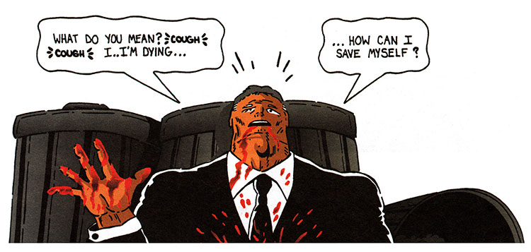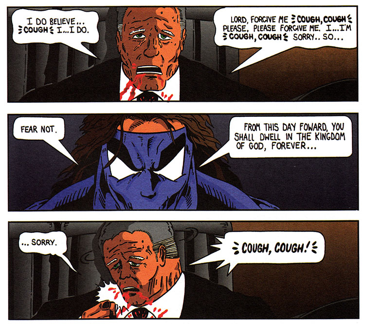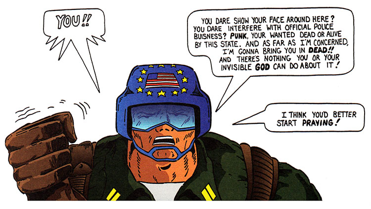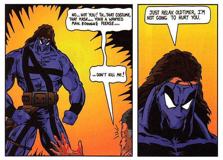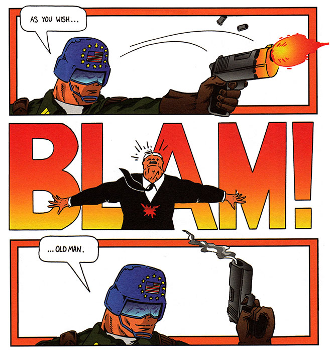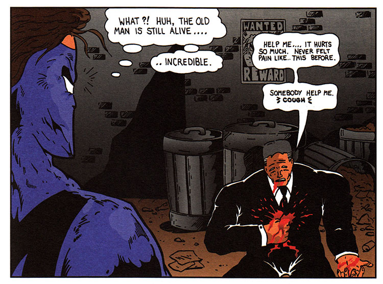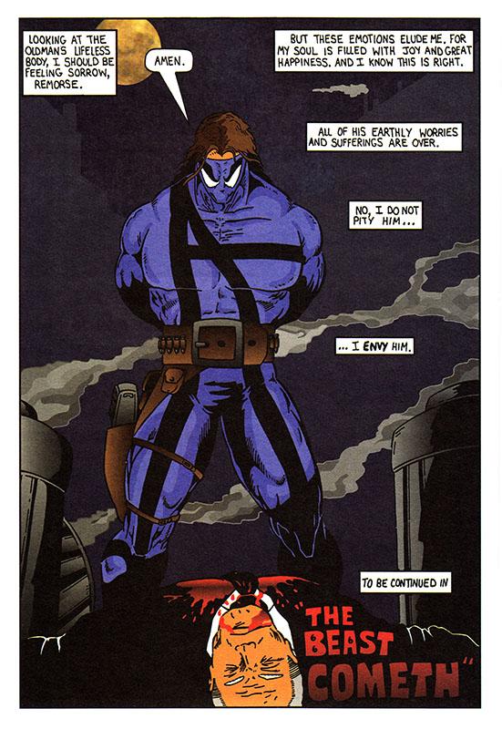 Hey Anticipator, mister hero with the guns and the giant muscles and everything, you know when a good time to preach at the bad guys would have been? BEFORE they shot the old man, that's when. Not after. Before.
