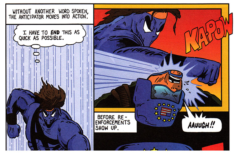 His name is Brent Black, but he's better known as the Anticipator. Who is, in turn, better known as "trouble." He's changed so much in such a short time! Mostly thanks to the inflatable-muscles suit he bought, and his spinal dislocation.