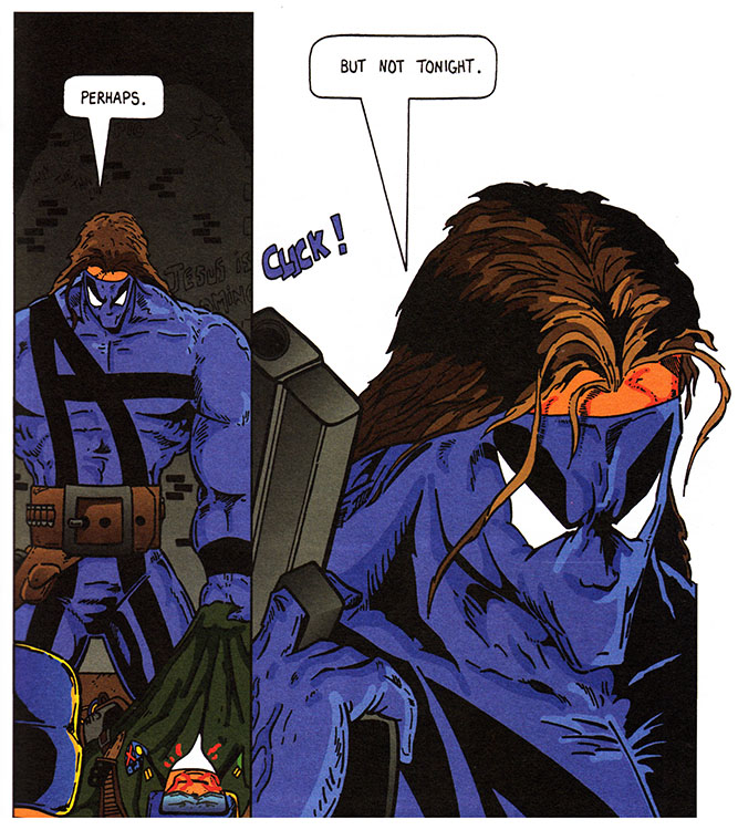 Anatomy, grossly exaggerated; chin, shrinking by the minute; feet, invisible. If you want to know what comic books looked like in the 1990s, this is it! No wonder they command such impressive prices on the collector's market, he said sarcastically!