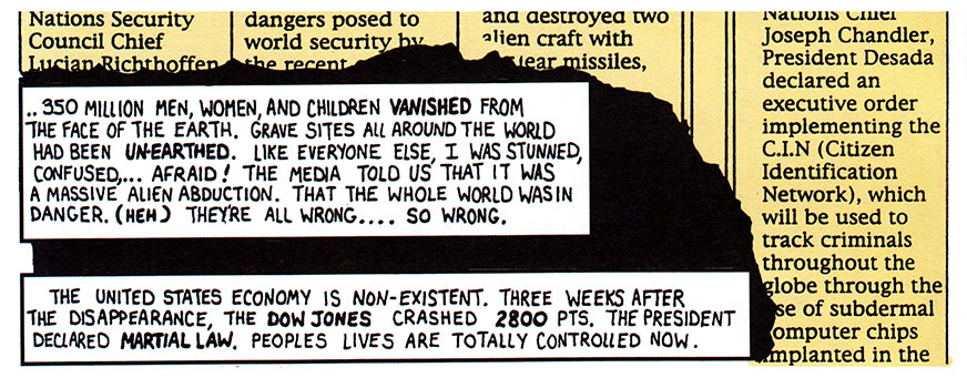 The missing people were called up by the Lord so they'd escape the terrible days that followed, days in which badly drawn masked men would make poses and talk to themselves.