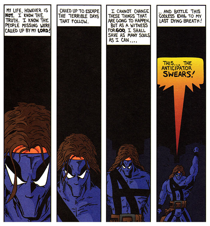 So while you struggle through the collapse of civilization, anticipate enjoying the adventures of The Anticipator, and whatever is going on with his hair, eyes, face, and his body structure in general. He has a lot of problems besides living in a fallen world.