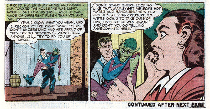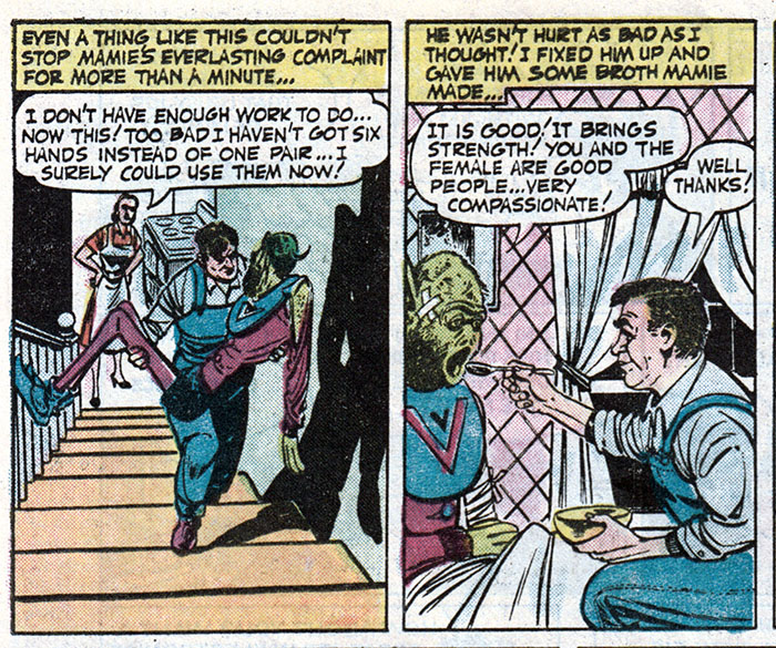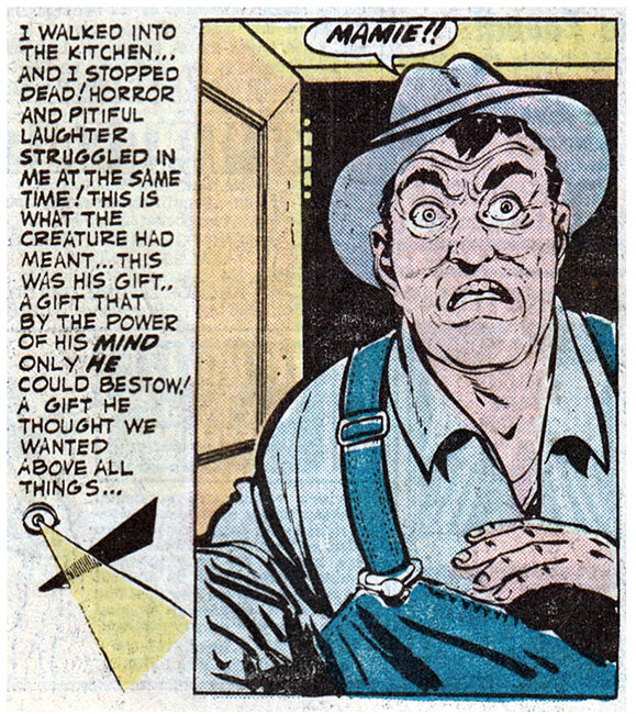 Stopped dead in horror! Shocked beyond all comprehension at what the spaceman had given Mamie! At no point could I have put two and two and two together to come up with the answer to what this alien creature, who might not understand how Earth people say things that aren't meant to be taken literally, could have done to my wife that would be a response to something Mamie was always saying! I guess I'm kind of dim!