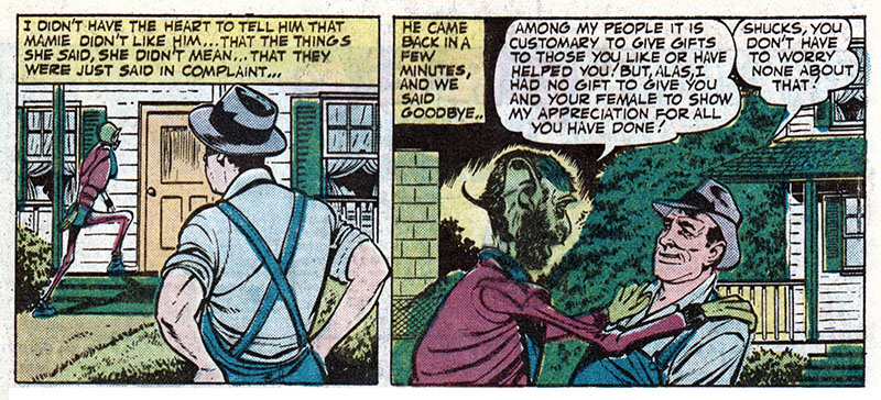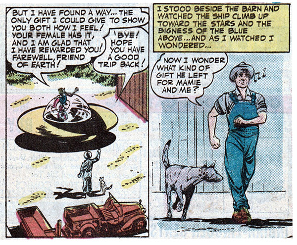 Well now, he found something to give us, and he gave it to Mamie! I sure hope that space alien has a smooth journey back to his home galaxy and that he hasn't implanted my wife with some sort of horrifying XTRO-type monster bound to erupt forth in a bloody explosion of terror that'll leave a trail of corpses in its wake. That would just be plumb awful.