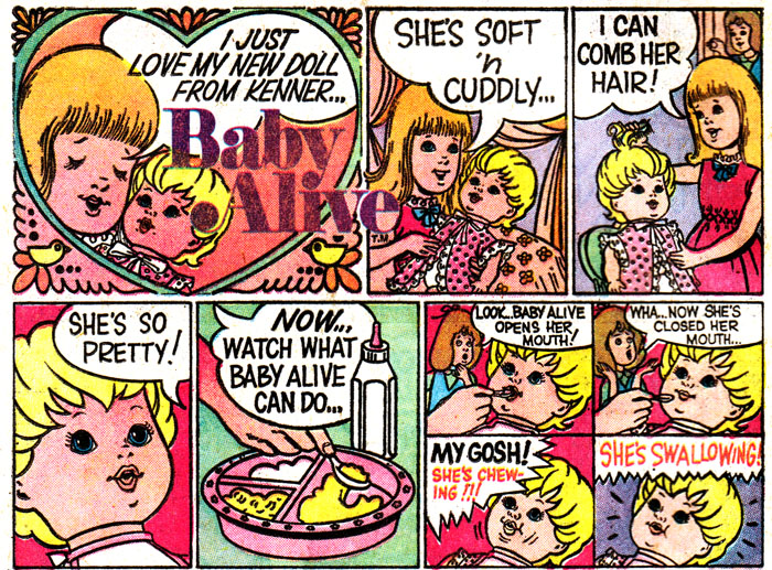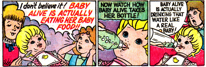 First, for the little girls, at least the ones with a nurturing bone in their body that can't be satisfied with dressing up Kitty in a bonnet and baby booties: Baby Alive, the result of months of product testing after the failed launch of Baby Dead. Just look what Baby Alive can do! She opens her mouth! She closes her mouth! She... SHE CHEWS. OH MY GOD SHE'S SWALLOWING!!!! FOR THE LOVE OF ALL THAT'S HOLY STOP HER