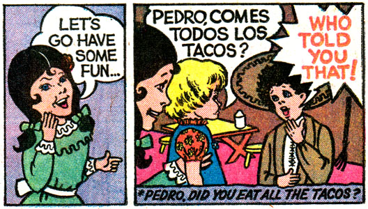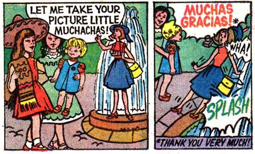 Having disposed of the thieving Pedro and taken his sombrero as a souvenir, our bilingual heroines adjourn to the town square, where they use their terrifying robot companion to scream at a homunculus that appears to be about 2 feet tall, sending her floating into a fountain.