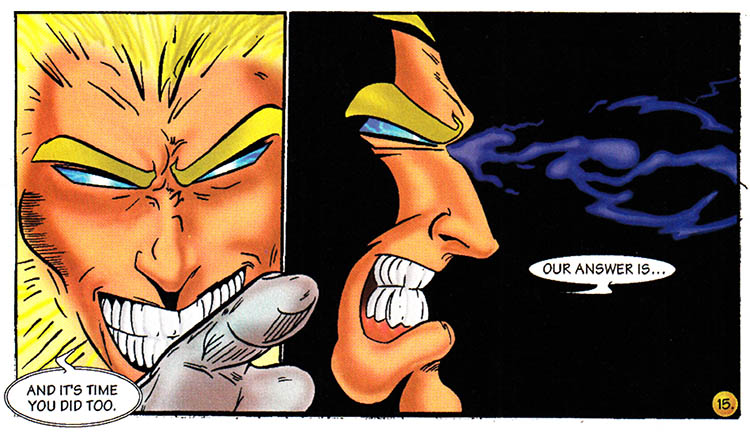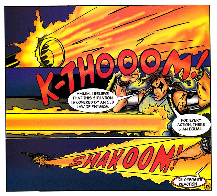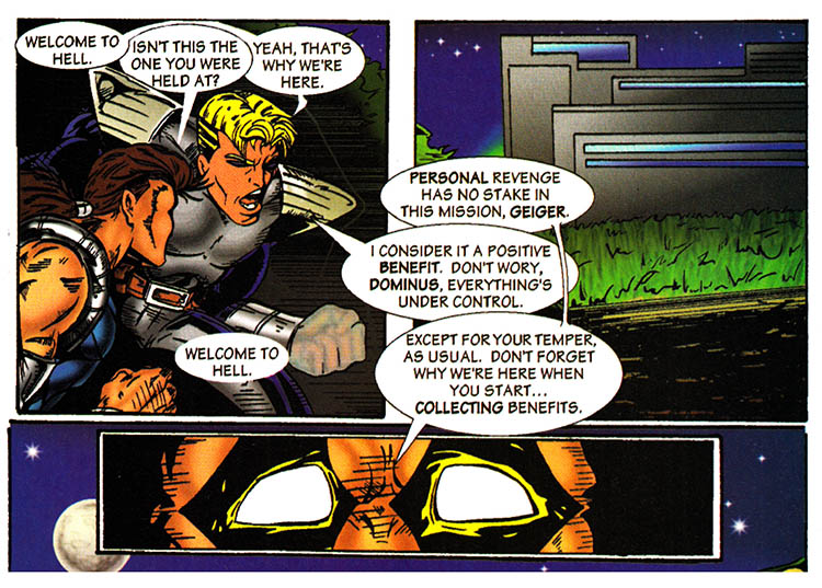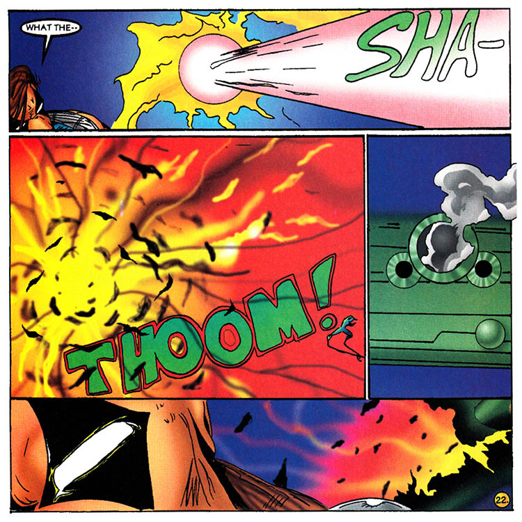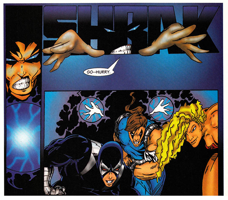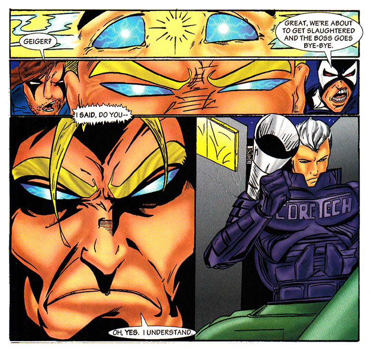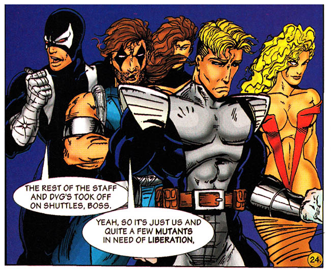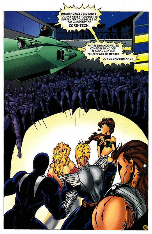 The battle is over, hundreds of Core-Tech soldiers flee in terror or are sprawled defeated, while thousands of mutant prisoners are released, and this comic book is going to show us none of it. Because drawing is hard.
