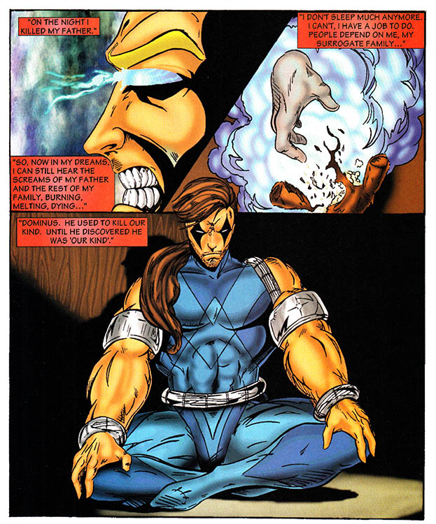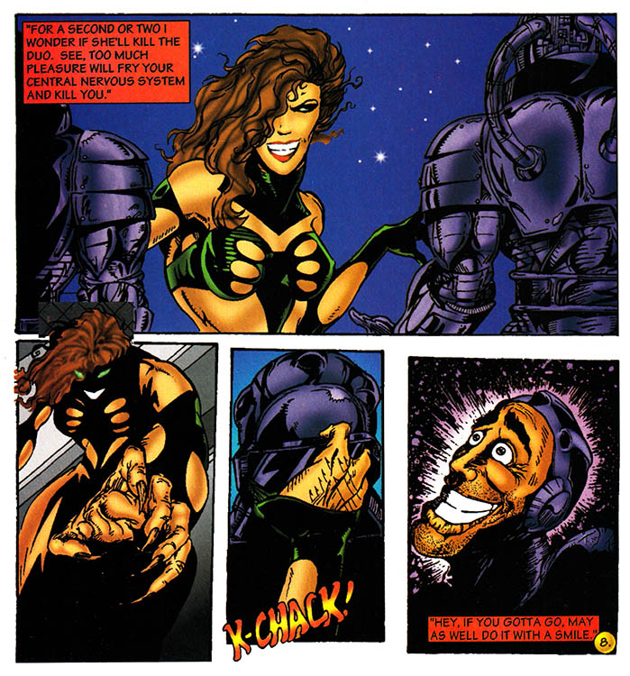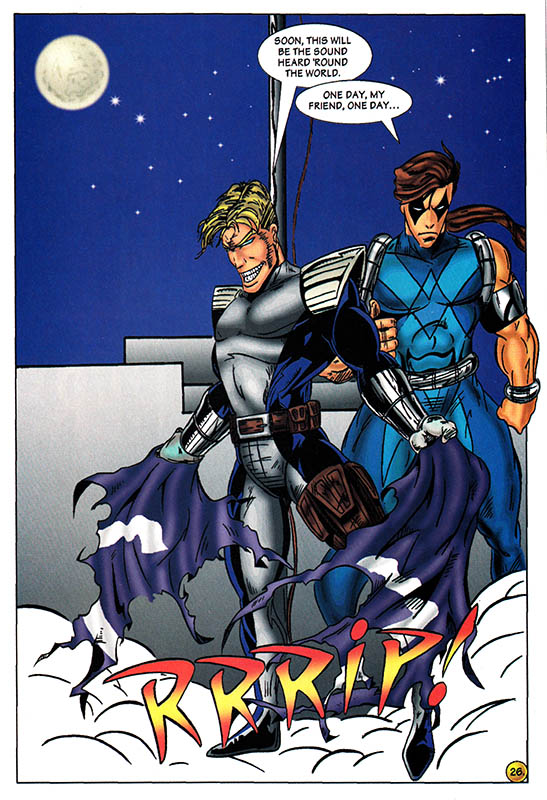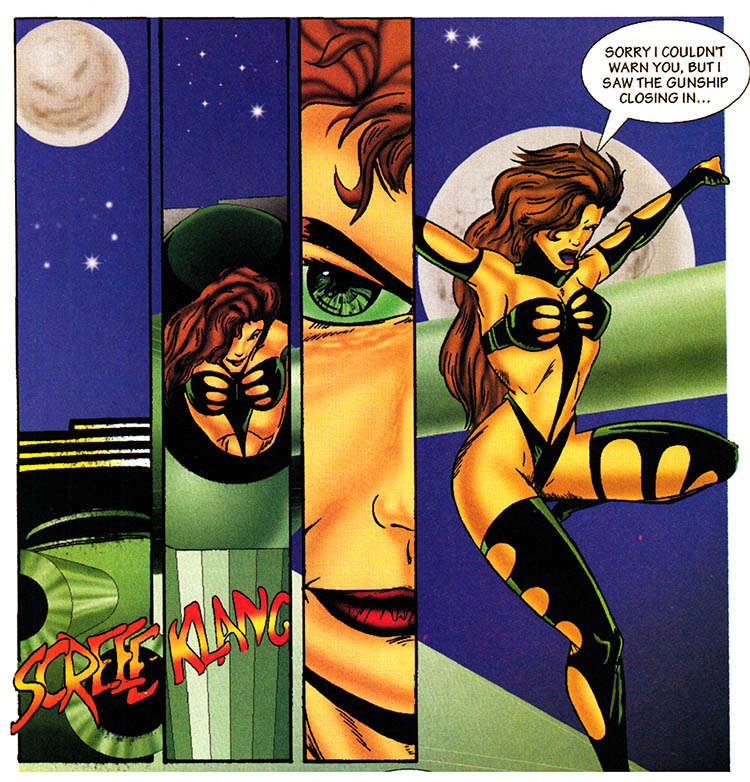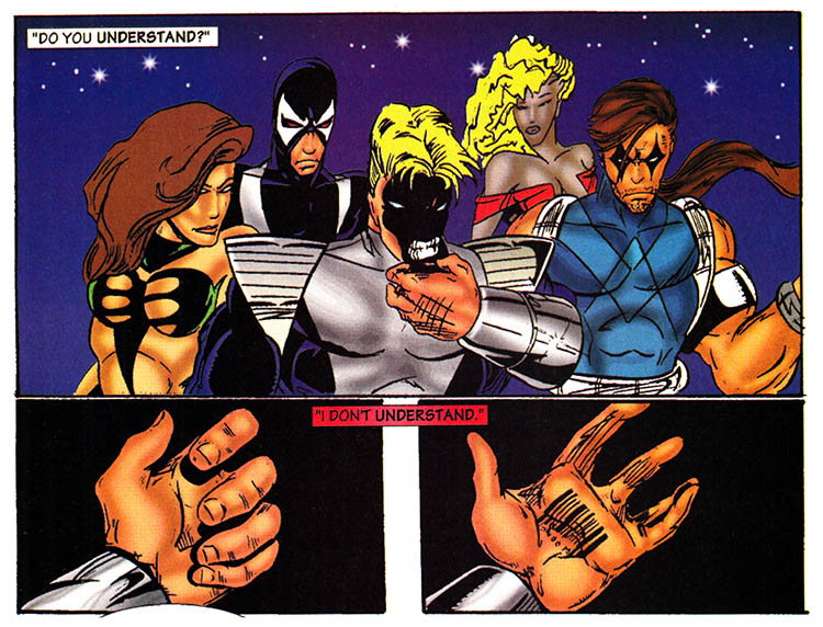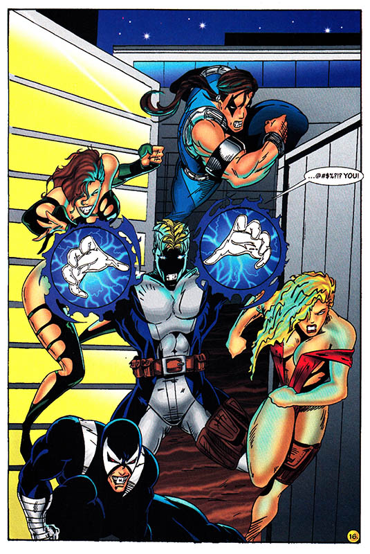 The clenched jaws, the awkward poses, the barely-there costumes on the ladies, the lack of feet, the foil-stamped legend informing us that this collector's item is extremely limited to only five thousand copies - to the connoisseur of the Gnarly Age Of Comics, all these signifiers might as well be hollering "THE NINETIES!!!" into our ears with all the fury of an MTV extreme sports announcer jacked up on a week's worth of complimentary Mountain Dew.