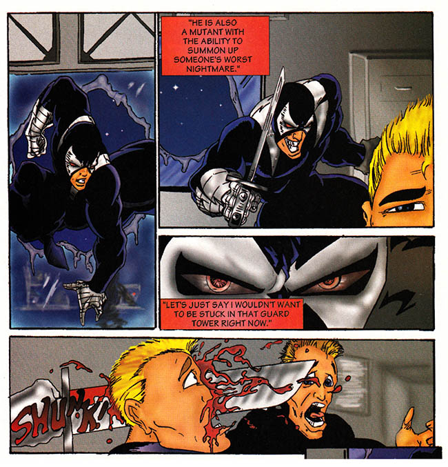 Hey, let's cybernetically enhance a mutant and train him to make a guy think he's being knifed in the skull. Sure, it's way more trouble than just actually knifing a guy in the skull, but here in the future, style counts!