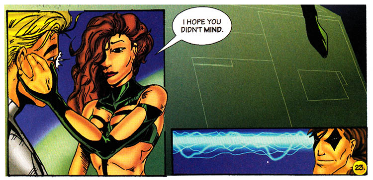 Page 23. Lightning erupts from forehead. The context says "jealousy" but the facial expression says "vague amusement."