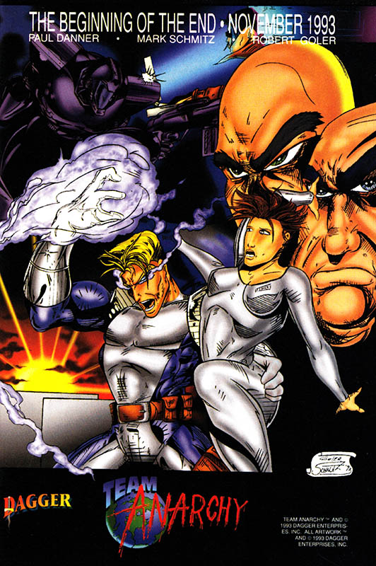 Team Anarchy just started and already it's the beginning of the end? Tell that to the two bald guys whose skulls are merging together over there, and to Miss Leotard whose limbs are just beginning to splay painfully! And while you wait for the next issue, there's only one question on your mind, and that question is, how can you more fully engage with the amazing world of Dagger Comics and all their incredible characters?
