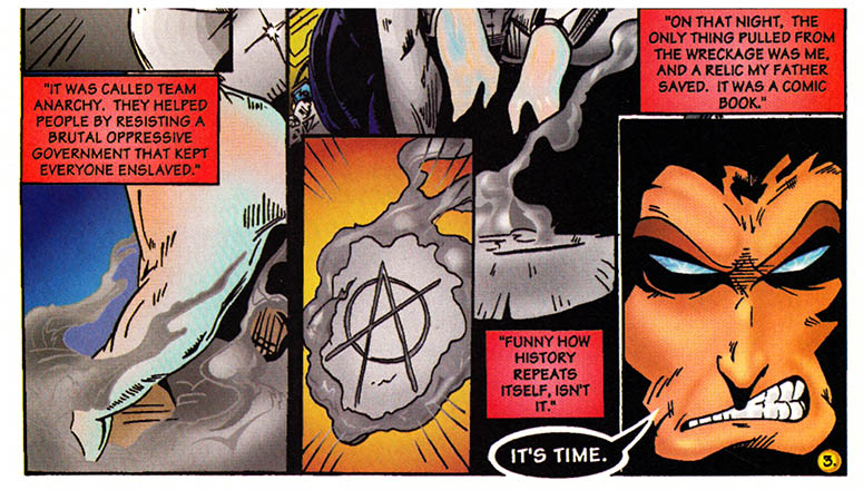 Anarchy! Fuel for many a lengthy conversation between political philosophers amidst the cafes and salons of Europe, or the barely coherent battle cry of a fifteen year old with his first Circle Jerks cassette and a grudge against the skateboard-hating manager at the local McDonalds. Or, perhaps, just maybe, could it be the vital ingredient that gives what at first glance is just one more half-assed Image Comics knockoff enough verve and energy to break out of the pack and produce a work of comic book brilliance?