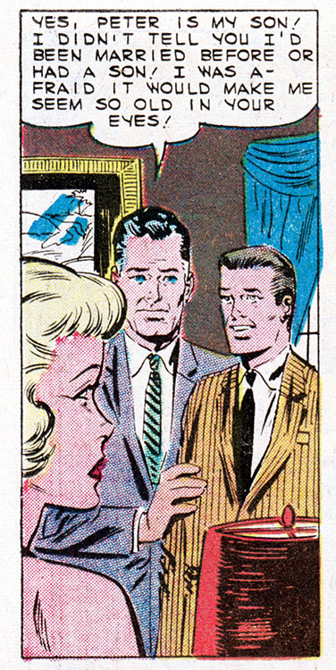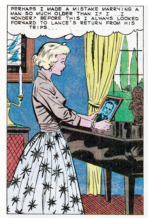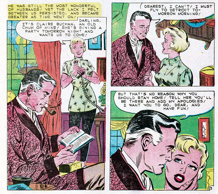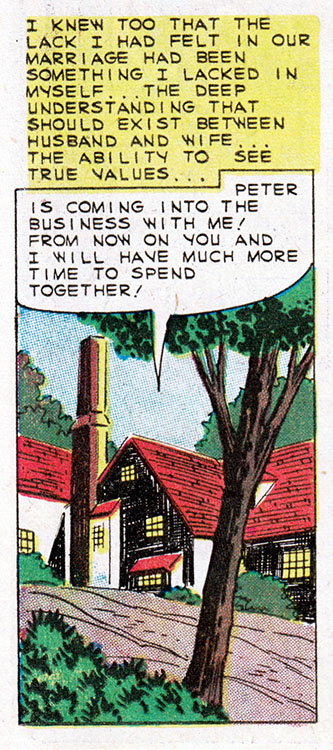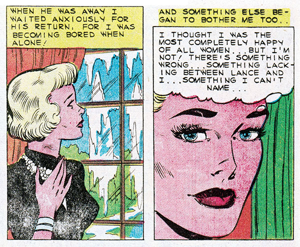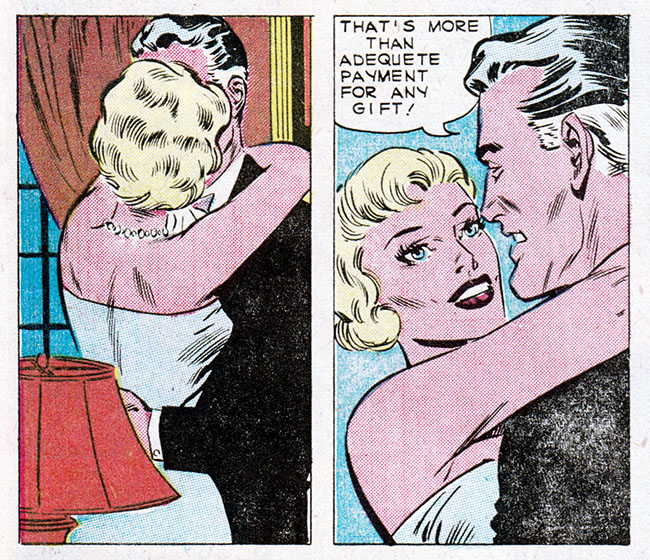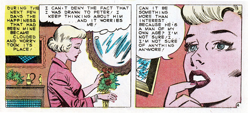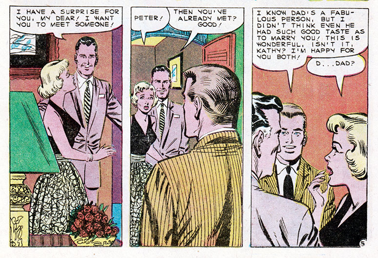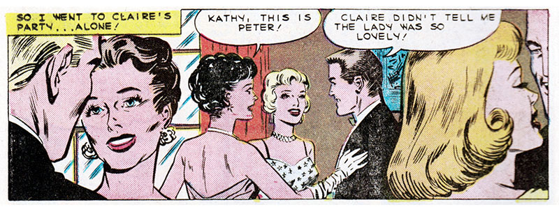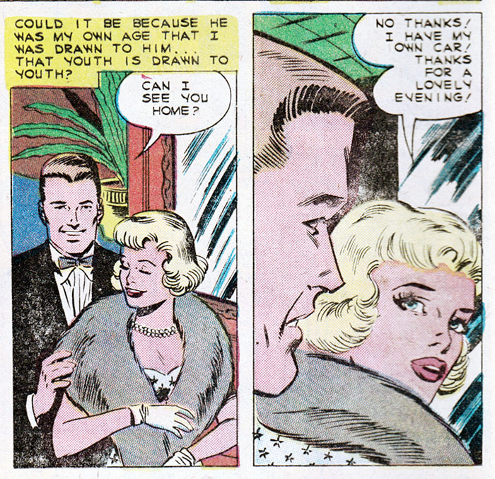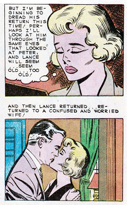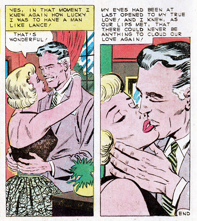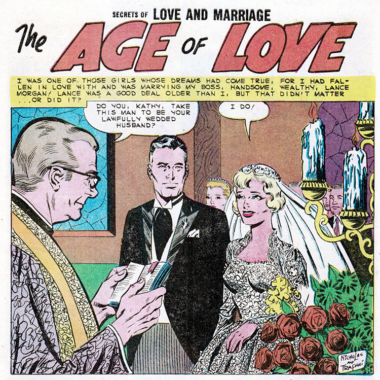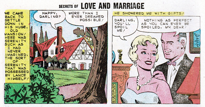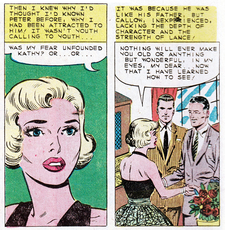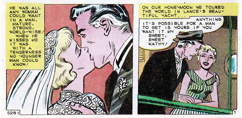 Comic books, duh. Only comics have the all-seeing omniscience to deliver fundamental truths about the human condition. That's why when Kathy here marries her boss, an older and wealthier man, we can be sure all her dreams have come true. Or have they?