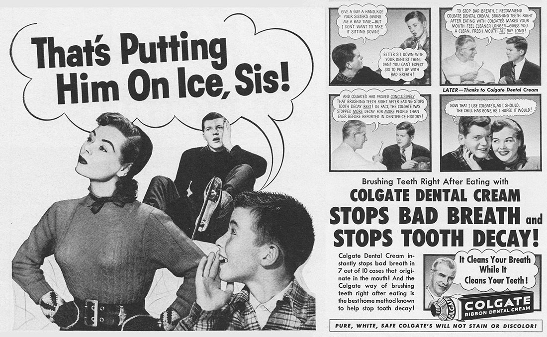 That's putting him on ice, sis - knocking him senseless with one swipe from your steel-reinforced foundation garment! Don't worry Dan, just smear some Colgate on those teeth and watch romance bloom. Remember, Colgate will not stain or discolor, which only makes me wonder, was that a thing toothpastes were doing before Colgate? Good luck out there, everybody!