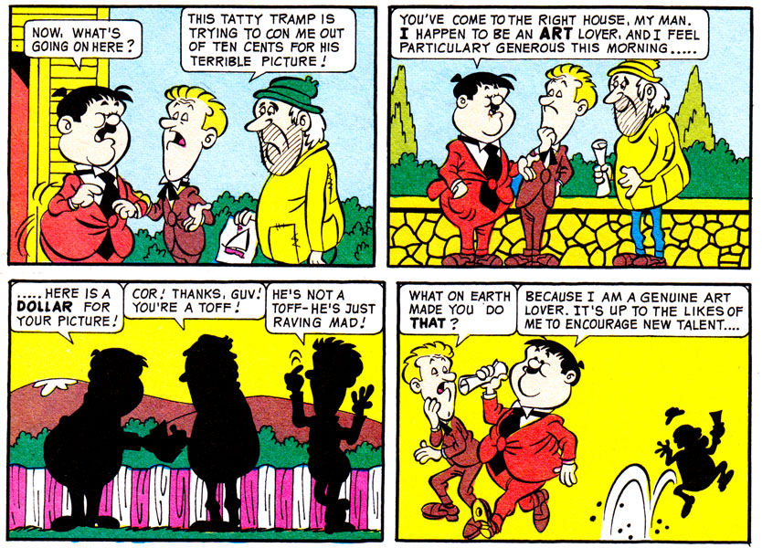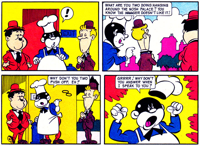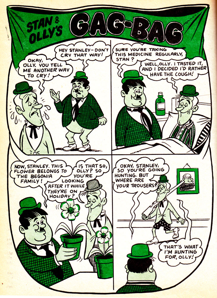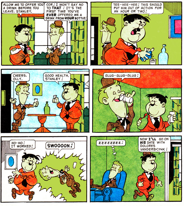 You can tell this is a British comic because the characters can get passed-out drunk. Or maybe Ollie roofied Stan, they're pretty vague what's in that bottle.