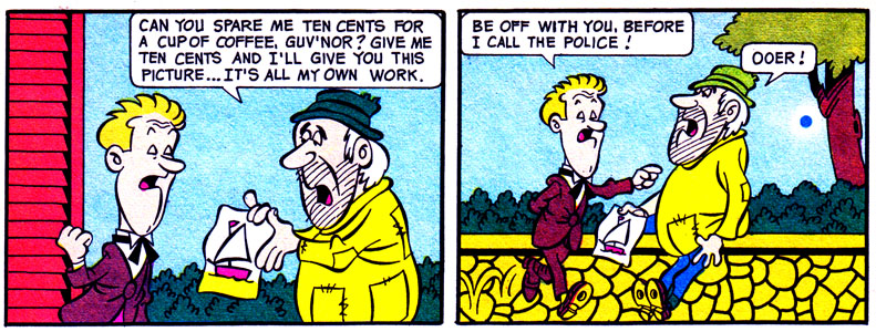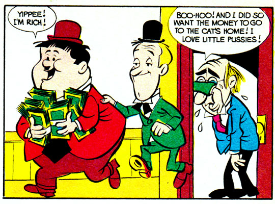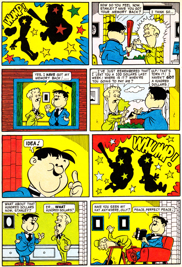 Like in this story, where Ollie tries to help Stan's memory by whacking him on the head with a club, then whacks him again to make him forget. This may not compare to the classic slapstick the real-life duo were known for, but it DID inspire Christopher Nolan's classic "Memento".