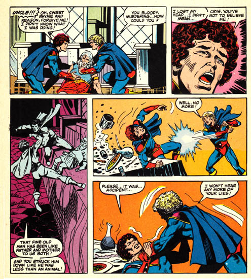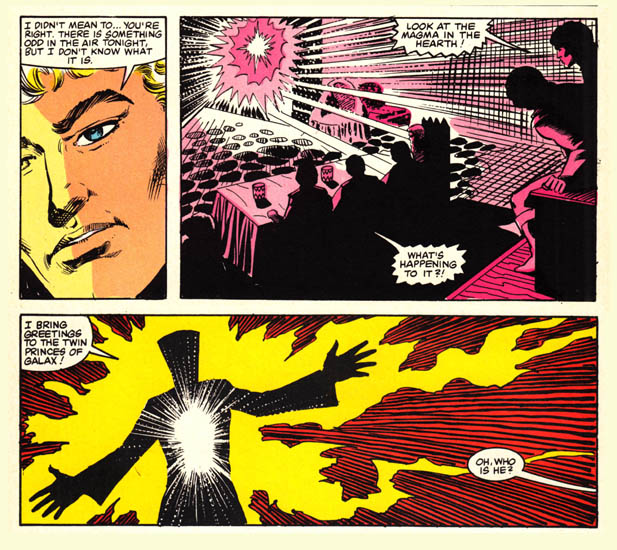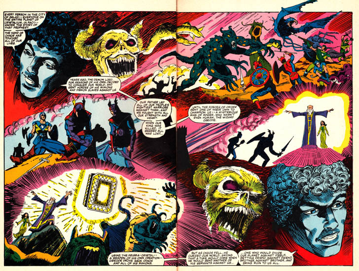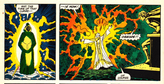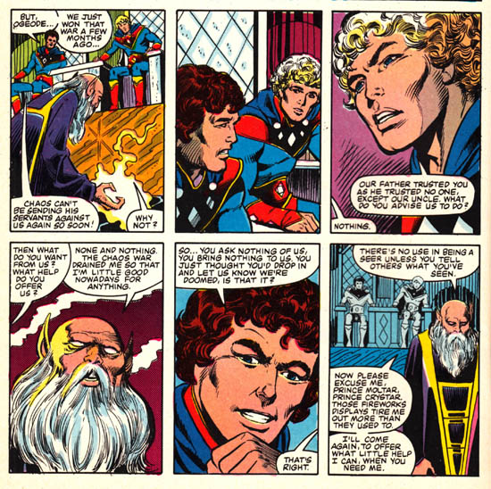 Turns out that amazing double-page spread of demons and skulls and fire and Prisma-Crystals, all that happened only a few months ago! Boy, think of the exciting comic book THAT would have made! Giant monsters, super rays, fire, blood... but no. What WE get is brothers wrestling and super wizard Ogeode explaining how he's not good for much of anything any more, you're all doomed, good night. This is fantasy in the Marvel manner, people, feel the excitement.