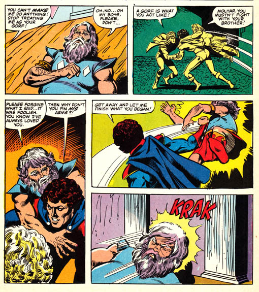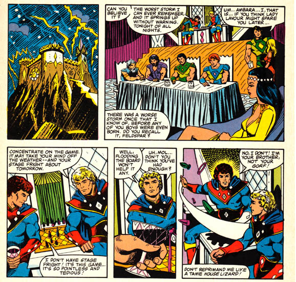 But it's steakknife to the rescue as Moltar fights back the only way he can - by puncturing his brother's vital organs!! Who would have thought that a story entitled "The Sundered Throne" and prominently highlighting a prophecy about brothers fighting each other would feature brothers fighting each other?? Besides everybody, I mean?