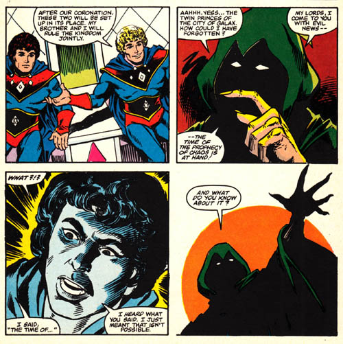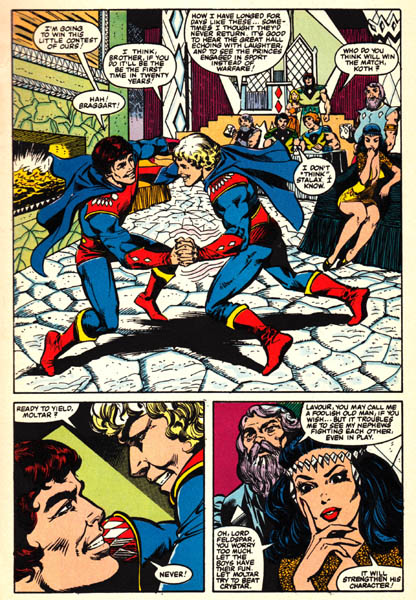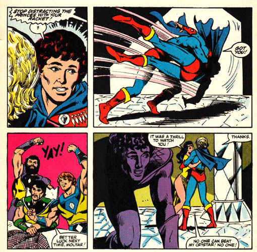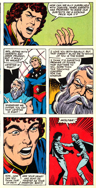 Our story opens with some brother-on-brother wrestling in the throne room of the kingdom of Galax on the planet Crystalium. Two princes, one's Crystar, one is Moltar, three guesses which one turns out evil! Hint: it's not the one the comic book is named after.